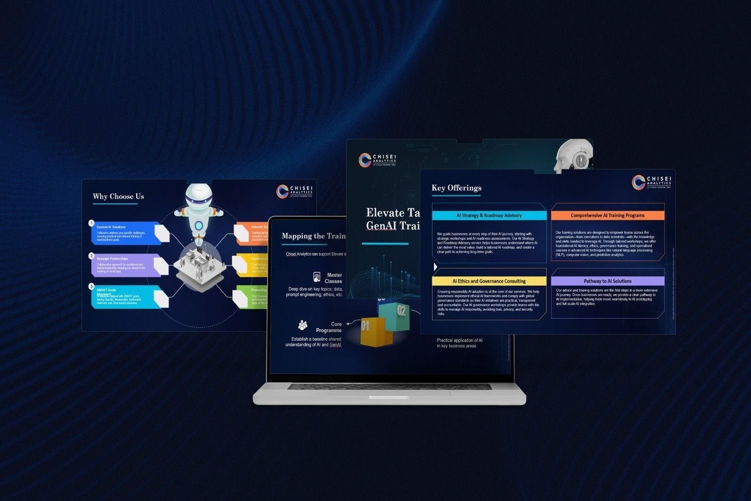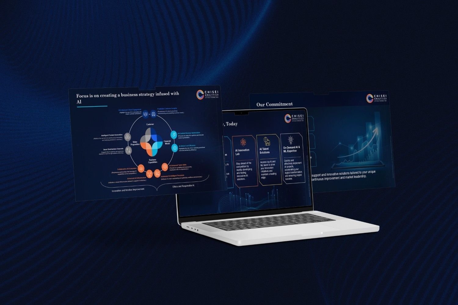 A well-structured and visually compelling AI consulting presentation design that strengthens Chisei Analytics’ brand positioning, communicates its enterprise AI capabilities, and supports client engagement and business development.