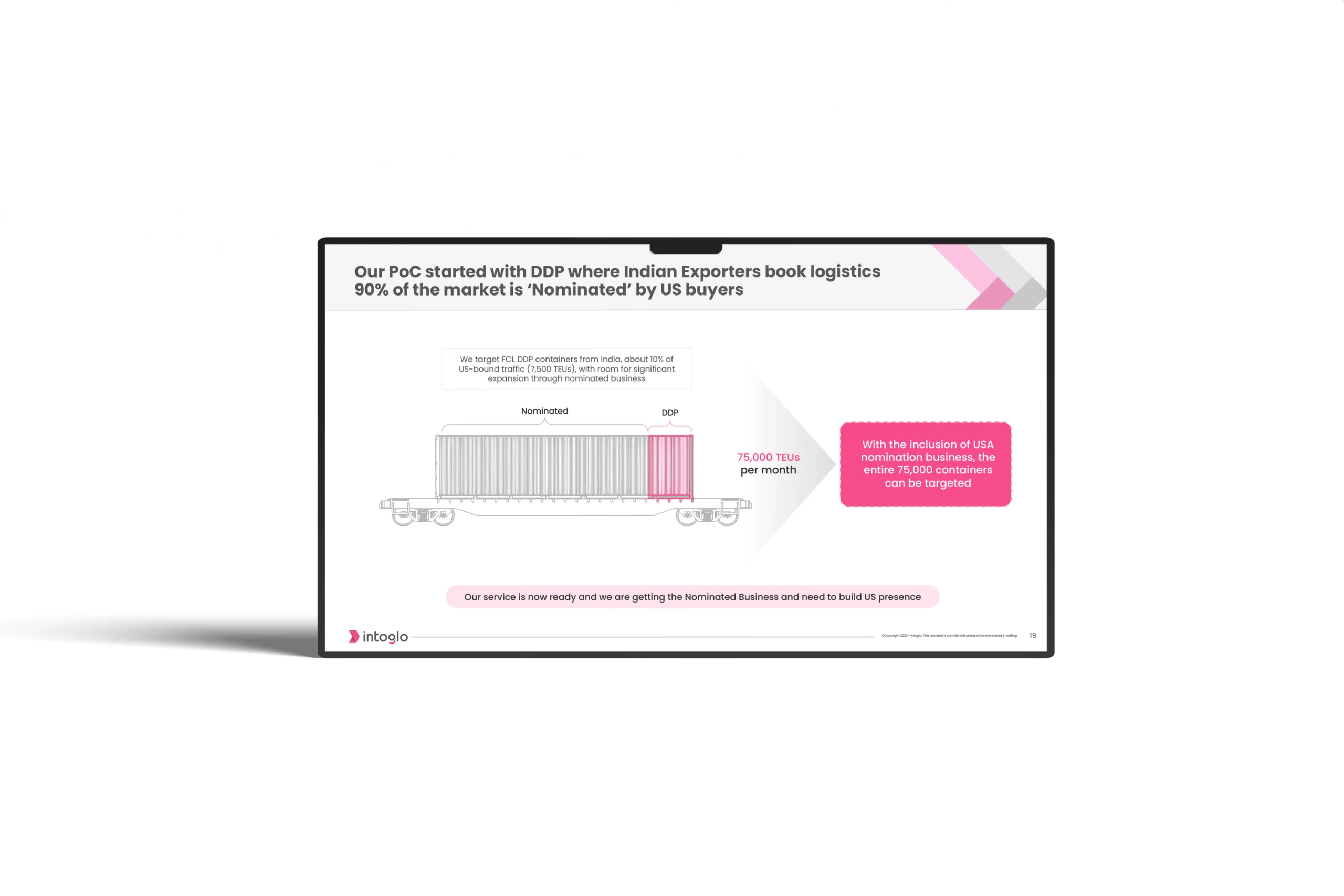 The deck needed to communicate Intoglo’s sharp strategic focus on India–USA FCL DDP lanes while establishing them as a long-term category-defining player.