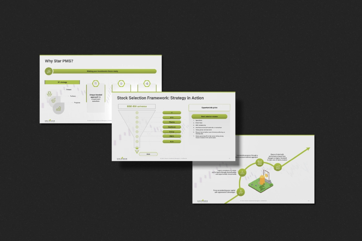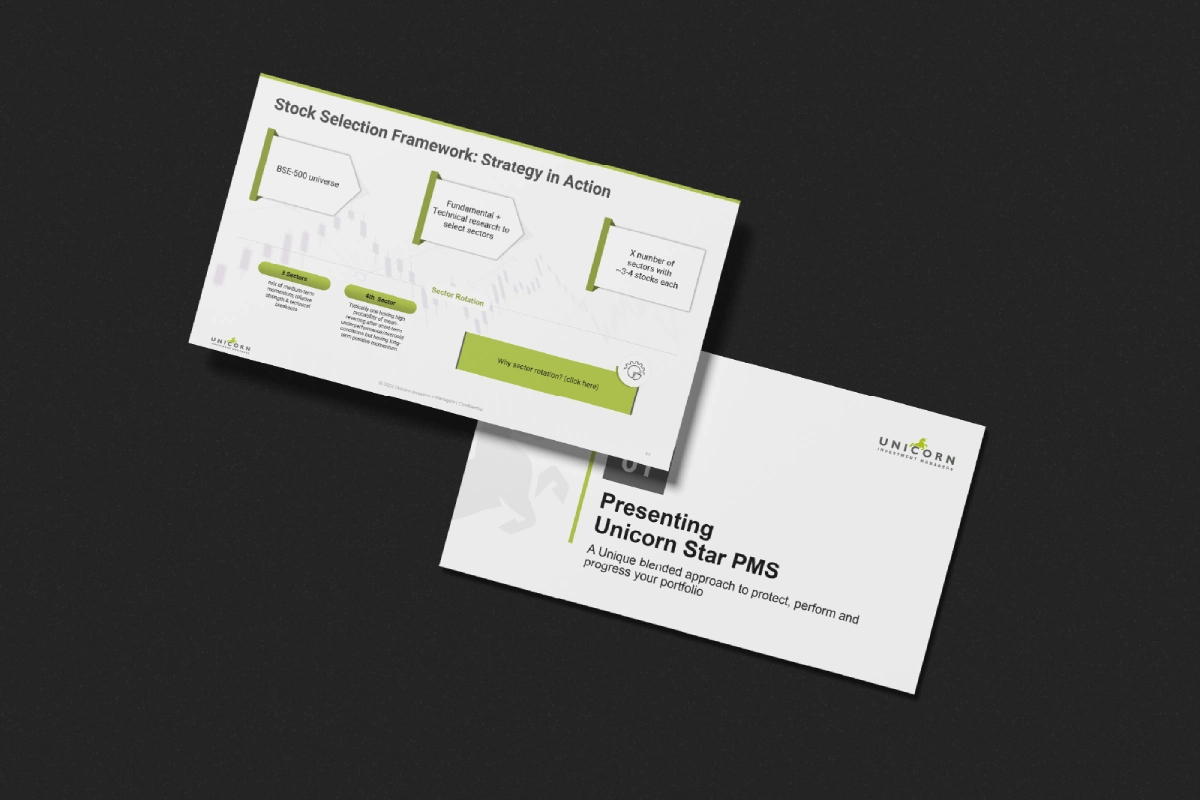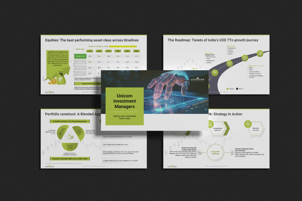 Creative Nexus successfully designed and delivered a high-impact sales presentation for Unicorn Investment Managers within a short timeline. The presentation effectively communicated their SEBI-registered Portfolio Management Service, investment philosophy, 3P strategy, and value proposition with clear storytelling and premium visual design.
